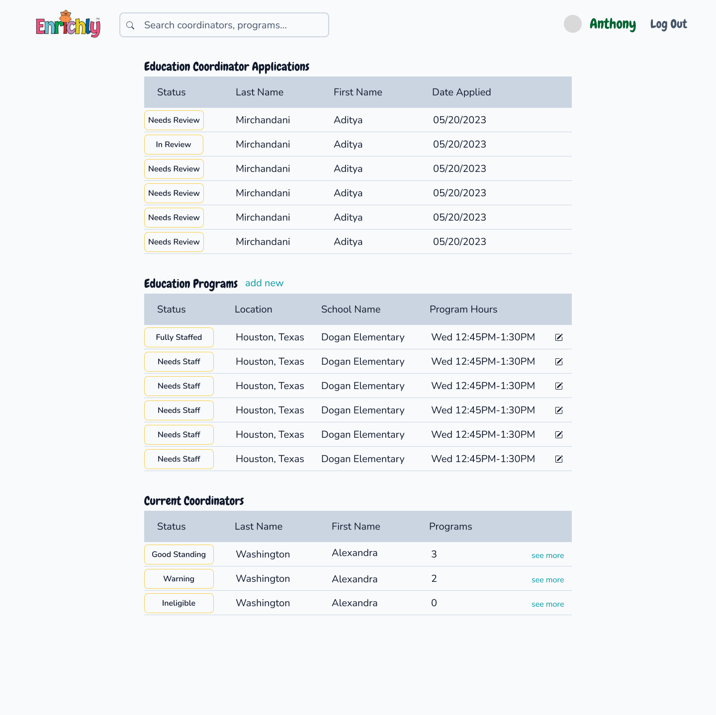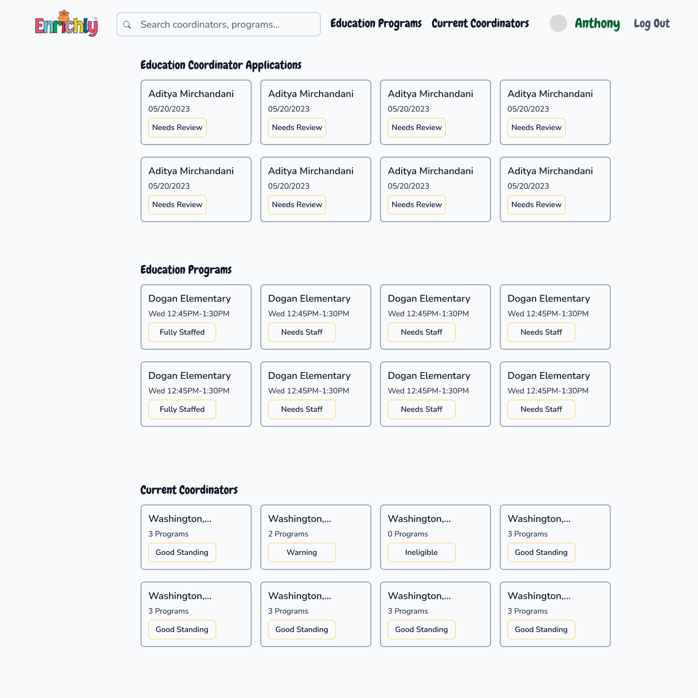 Our teams solution was to spearhead the ideation and design of an internal dashboard for Enrichly employees to manage the courses they teach and the coordinators that they manage.