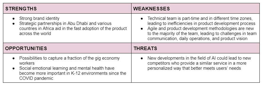 To understand Enrichly’s strengths, weaknesses, opportunities, and threats so that the team can have a full awareness of all of the factors involved in developing the Education Coordinator product.