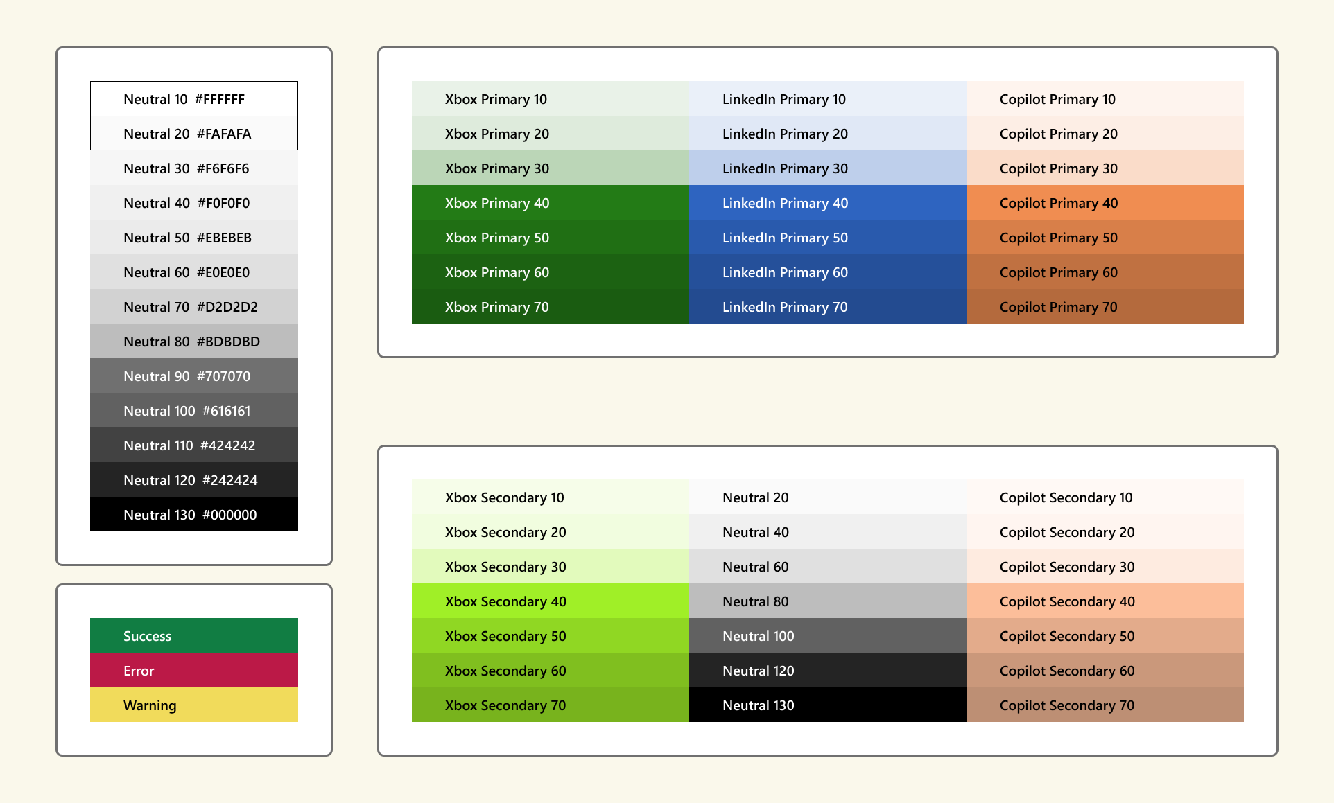 The updated color palette has been simplified to create a cleaner, more cohesive look. By focusing on fewer, more versatile colors, we’ve improved usability and accessibility while ensuring that the brand identity remains strong among Xbox, LinkedIn, and Copilot. This streamlined set will better guide users through the interface, helping them focus on key content while maintaining visual appeal.