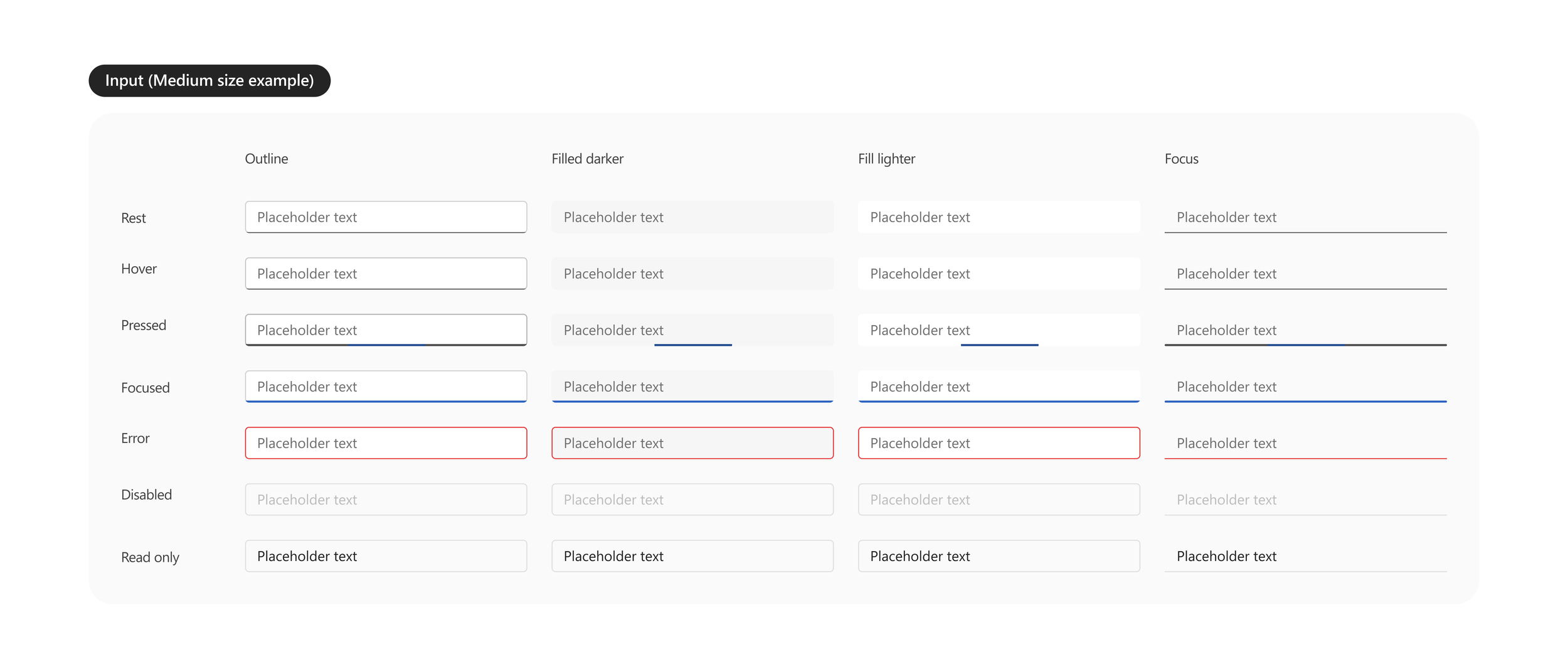 We focused on establishing a consistent set of input fields across Microsoft’s platforms, ensuring a seamless and familiar user experience across products. To accomplish this we standardized elements such as the border radius, font sizes, and button sizes. We also optimized placeholder texts within these fields for clarity and legibility. This comprehensive approach to input field design promotes a more intuitive and unified user interface across Microsoft's ecosystem.